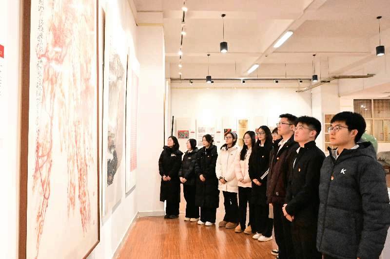 师生们在讲解员的引导下,有序参观了展览的三个核心单元。本次展览紧扣纪念“一二・九”运动90周年主线,以“丹青红韵、铭史铸魂、爱国担当、赓续相传”为主题,精选129件优秀作品,涵盖中国画、油画、版画、水彩、综合材料及书法篆刻等多种艺术形式。在“山河危局・历史回响”单元,一幅幅作品生动再现了“一二・九”运动时期的历史场景,笔触间饱含着对民族危亡的忧思与对家国命运的担当;“精神永续・青春向上”单元通过艺术语言诠释了“一二・九”精神的传承脉络,传递出青春不息、奋斗不止的昂扬斗志;“砥砺奋进・自信自强”单元则聚焦新时代中国式现代化建设的火热实践,以鲜活的艺术形象展现了国家发展的丰硕成果与民族复兴的光明前景,彰显了新时代中国人的自信与担当。