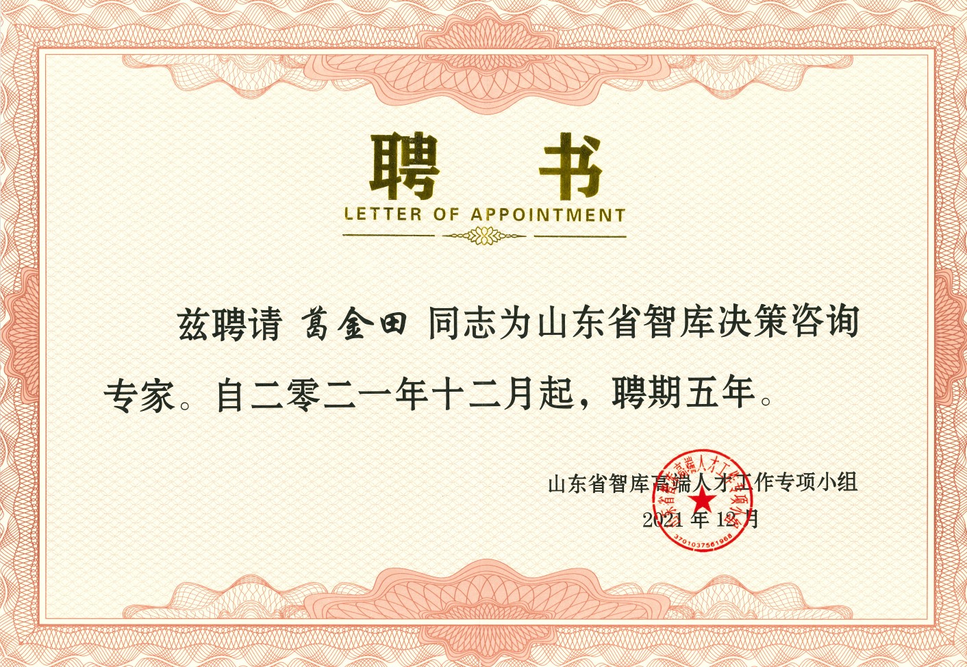 近日,接山东省智库高端人才工作专项小组办公室通知,标准化产业桃花视频 院长葛金田教授被续聘为山东省智库决策咨询专家,聘期自2021年12月算起,为期五年。