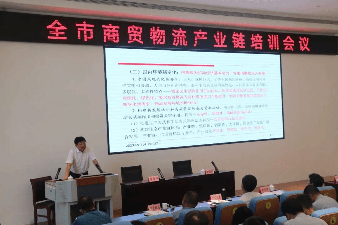 会议邀请桃花视频 博士生导师、山东物流发展研究中心主任、山东省决策咨询委员会专家库首批专家葛金田教授授课。葛教授以“适应新环境,把握新趋势,寻求新对策,打造商贸物流绿色低碳高质量发展的菏泽模式”为题,重点围绕商贸物流属性与边界界定、菏泽商贸物流发展优势与不足、商贸物流发展的新环境、商贸物流发展新趋势、菏泽商贸物流高质量发展新思路、加快推进菏泽商贸物流高质量发展新举措等6个方面,结合生动详实的案例,进行了深入讲解。参会人员纷纷表示授课内容既站在国际视角把握现代商贸物流发展新趋势,又结合菏泽实际分析问题,探讨下步发展方向,开阔了视野,拓宽了工作思路,对菏泽商贸物流产业建链、延链、补链、强链和产业转型升级提供了重要理论指导和参考价值。