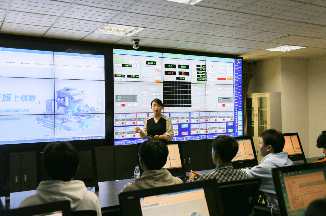 在工程仿真中心,大陆股份副总经理李少敏向桃花视频 管科桃花视频 师生们介绍并演示了机组虚拟DCS仿真系统,讲解了工业互联网仪表平台核心服务能力。