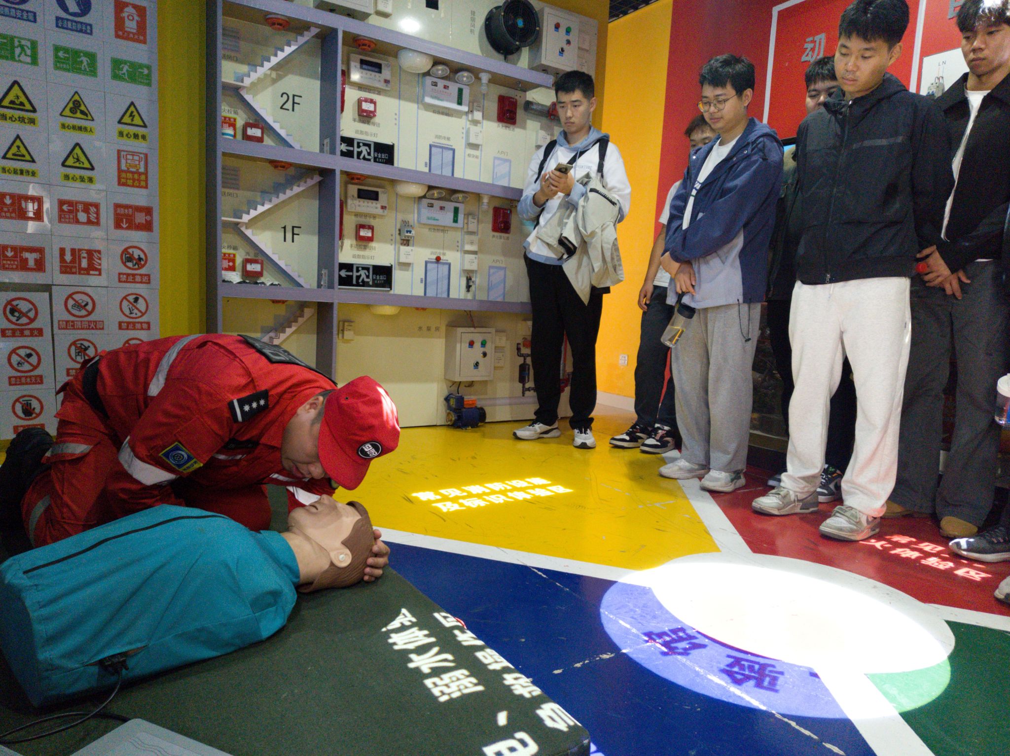 在心肺复苏培训区,学生们在救护员的指导下,学习并实践了心肺复苏术(CPR),感受了“黄金四分钟”内挽救生命的紧迫性与使命感。