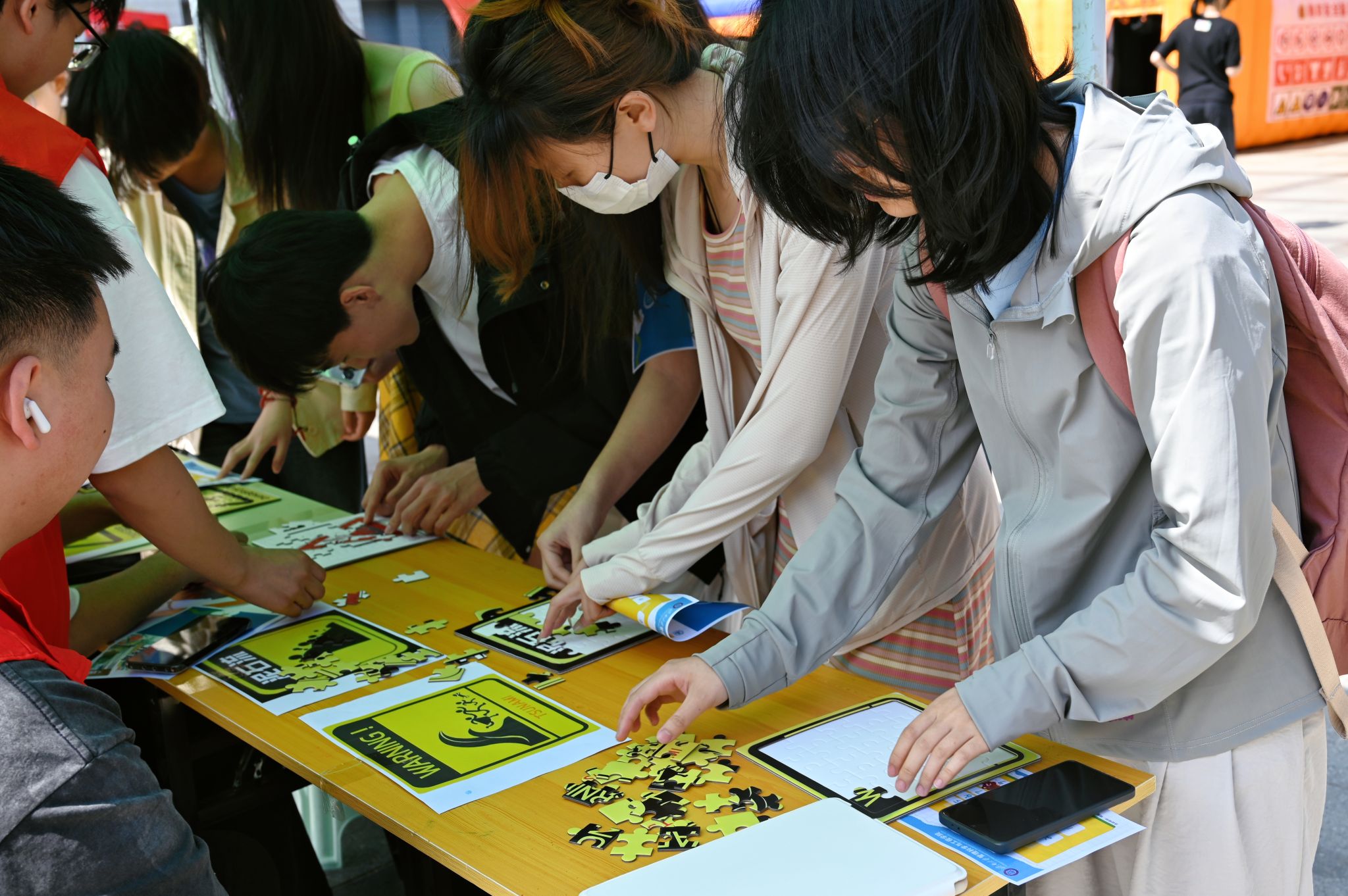 在经管楼广场前,益救应急协会精心设置救灾救援装备展示、场景应急模拟实训、智趣应急知识强化三大沉浸式教育展区。英雄山消防站指战员逐一讲解生命探测仪、液压破拆工具组等先进救援设备的功能与使用场景,学生们零距离观察装备细节,触摸钢铁救援利器,直观感受科技赋能救援的力量。场景应急模拟实训区通过灾害逃生模拟通道、灭火器材演练等设备,进行“应急避险-器材使用-协同救援”全流程演练,让参与者能够在近乎真实的灾害场景中学习应急避险技能,掌握正确逃生方法与自救互救要点。智趣应急知识强化区通过防灾减灾知识卡、安全标志拼图等趣味形式,引导师生辨识生活中常见的灾害隐患,实现防灾知识可视化、应急要领具象化。