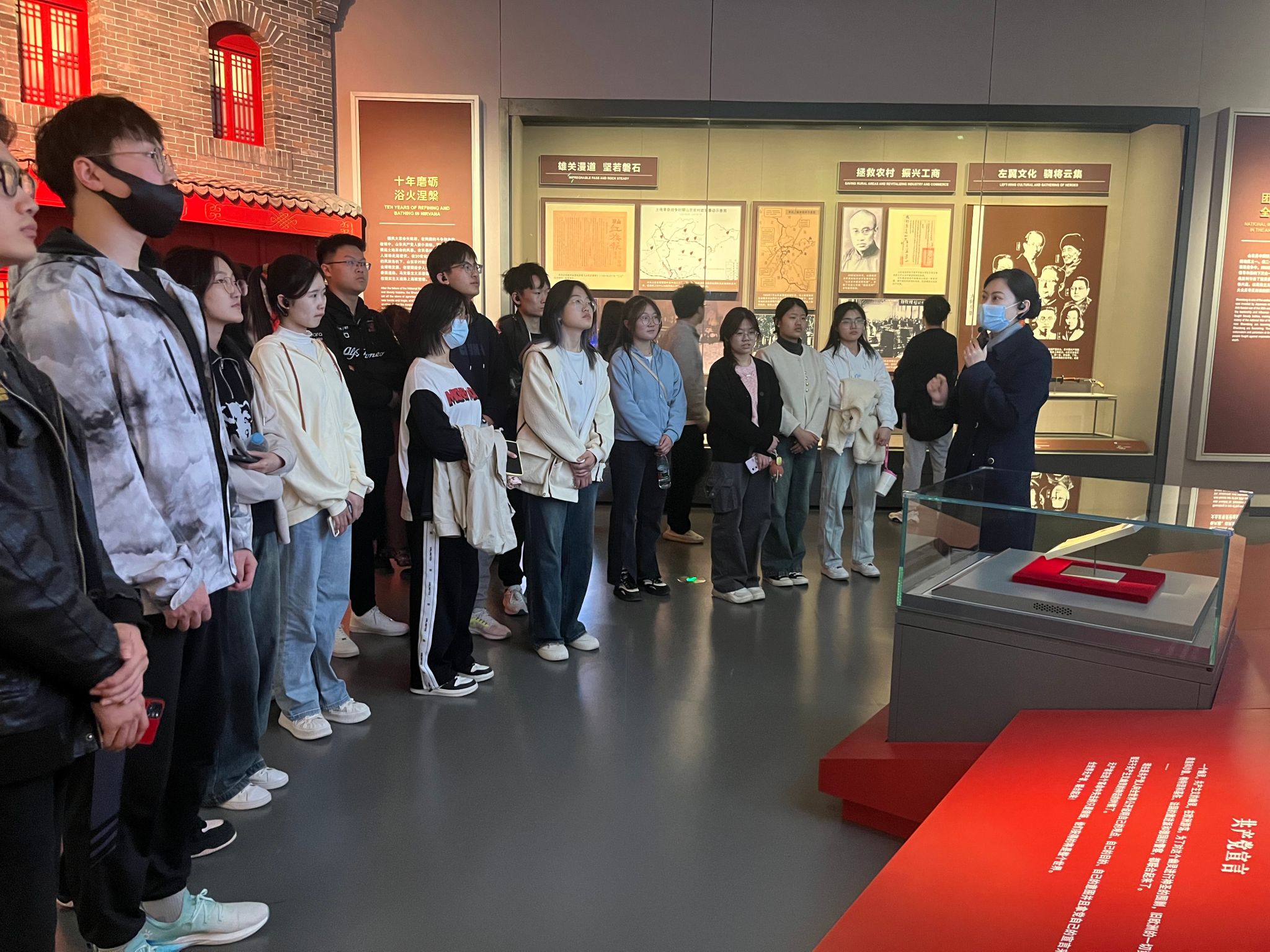 党员、团员同学们跟随讲解员的步伐,聆听近现代山东180多年来创榛辟莽、沧桑砺洗的历史以及山东红色革命历史筚路蓝缕、风雨兼程的百年奋斗史。馆内陈列的《共产党宣言》犹如一盏明灯,指引着革命的道路;王尽美、邓恩铭等革命先烈的生平事迹,展现了他们为革命理想英勇斗争的壮丽篇章;沂蒙精神的传承,彰显了人民群众在革命战争中的伟大力量;济南战役的英勇事迹,则铭记了那段浴血奋战的峥嵘岁月。