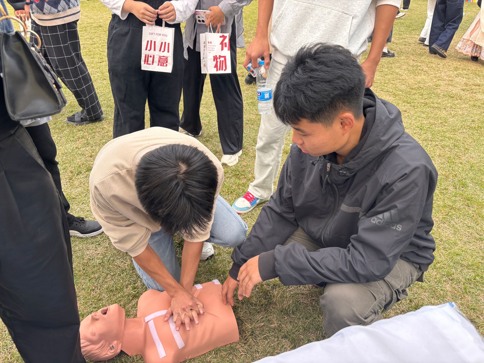 为了让急救知识更加贴近学生生活,益救应急协会设立了“急救地摊”。在这里,经过红十字培训的社团成员化身“急救达人”,通过互动体验、实操演练等形式,向过往师生传授心肺复苏、AED使用等基础急救技能。通过模拟实操,让大家在轻松愉快的氛围中掌握关键时刻能救命的急救技巧,共同传递生命的温暖与力量。