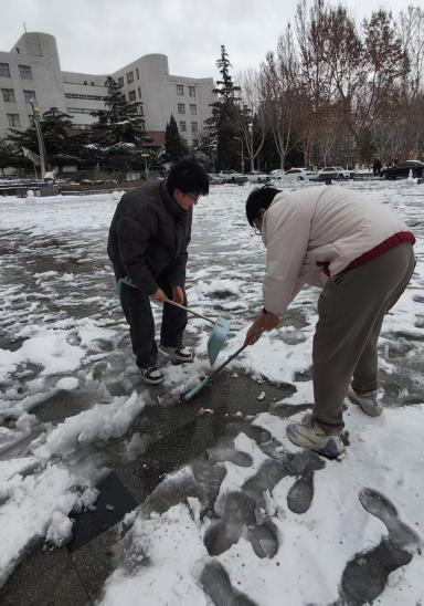 3月2日,济南市区普降暴雪,校园内积雪厚重。青年志愿者们手持铁锹、扫帚等工具,顶着寒风投入清扫工作。他们分工协作,有的铲除主干道结冰层,有的清扫教学楼台阶积雪,有的铺设防滑垫,对校门口、走廊、楼梯等重点区域进行地毯式清理。尽管双手冻得通红,但志愿者们干劲十足,热火朝天的劳动场景成为雪后校园最温暖的风景。经过两小时奋战,校园内外主要通道全部畅通,为即将返校的学生筑起“安全走廊”。