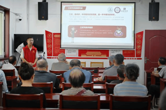 面对持续高温的严峻“烤”验,实践团将“三伏天防暑安全科普”作为服务民生的“小切口”。活动现场,队员们通过精心设计的模拟中暑场景演练,生动直观地向居民演示了从识别症状到实施救助的标准急救流程。讲解环节聚焦致命性热射病,清晰阐释其核心危险特征——当核心体温飙升超过40℃,将面临多器官功能衰竭的巨大风险。成员们依托图文并茂的科普展板,系统梳理了“高温劳作”、“密闭空间久留”等六大夏季安全禁忌,并贴心地给出“每日通风2次、每次至少15分钟”、“空调设定温度不低于26℃” 等易于操作的科学防护建议。本次课程正是以小故事把道理讲透,有效提升了居民的科学防护意识和自救互救能力,在潜移默化中传递了守护生命的价值理念。